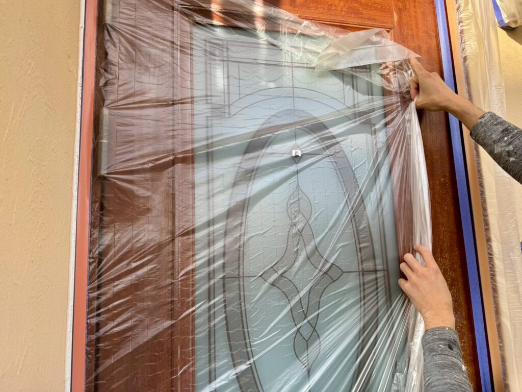 窓や土間などの塗装しない部分や、塗料が付着すると困る箇所をビニールなどで保護します。
