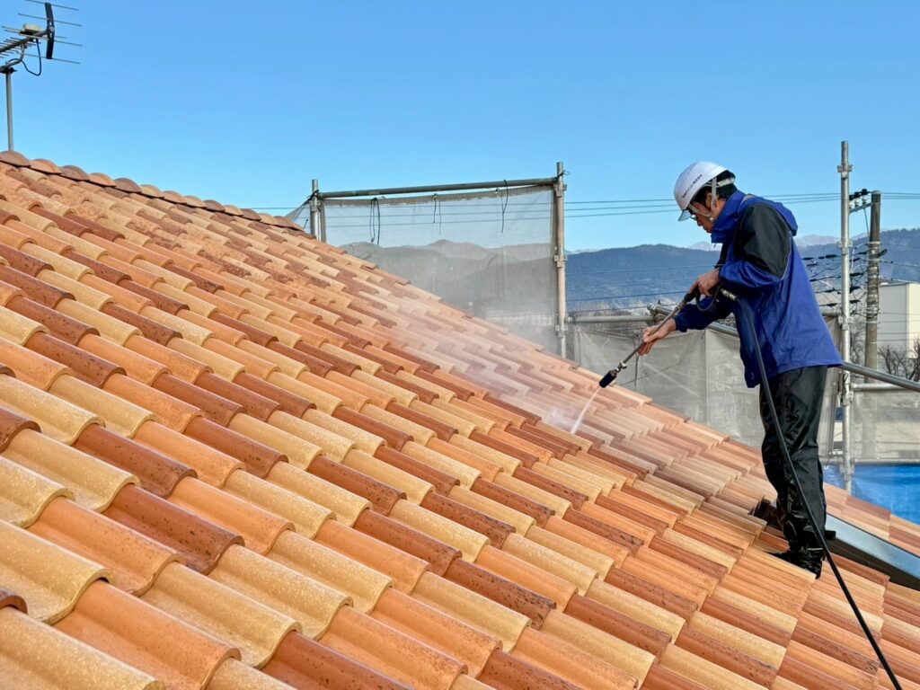 建物の外壁や屋根についたカビやコケ、砂ほこりなどを高圧の水で徹底的に洗い流します。